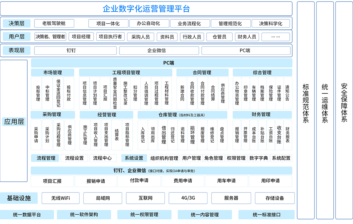 數(shù)字化管理系統(tǒng)對企業(yè)工程項(xiàng)目從項(xiàng)目投標(biāo)中標(biāo)、項(xiàng)目過程管理、合同管理、物資設(shè)備管理、采購管理、項(xiàng)目過程管理、施工隊(duì)管理、供應(yīng)商、成本核算等進(jìn)行全面綜合管理;縱向貫穿投標(biāo)、采購、施工、竣工的全過程,橫向涉及公司內(nèi)部的各相關(guān)崗位,是一套全方位、集成的企業(yè)項(xiàng)目綜合管理平臺。通過對成本、進(jìn)度、質(zhì)量、安全等方面的控制,以及對合同、結(jié)算、支付、資金等要素的管理,來提高工程類企業(yè)對工程項(xiàng)目的綜合配套能力。